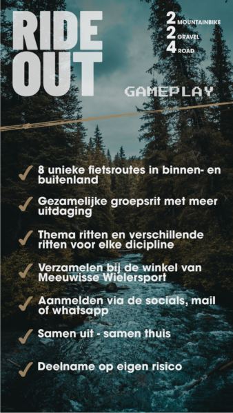 Wil je op de hoogte gehouden worden met het laatste nieuws? Neem dan deel aan de Social Ride Groepschat. Wil je meer weten over de andere RIDEOUT evenementen of meer weten over het concept? Bekijk de RIDEOUT pagina!